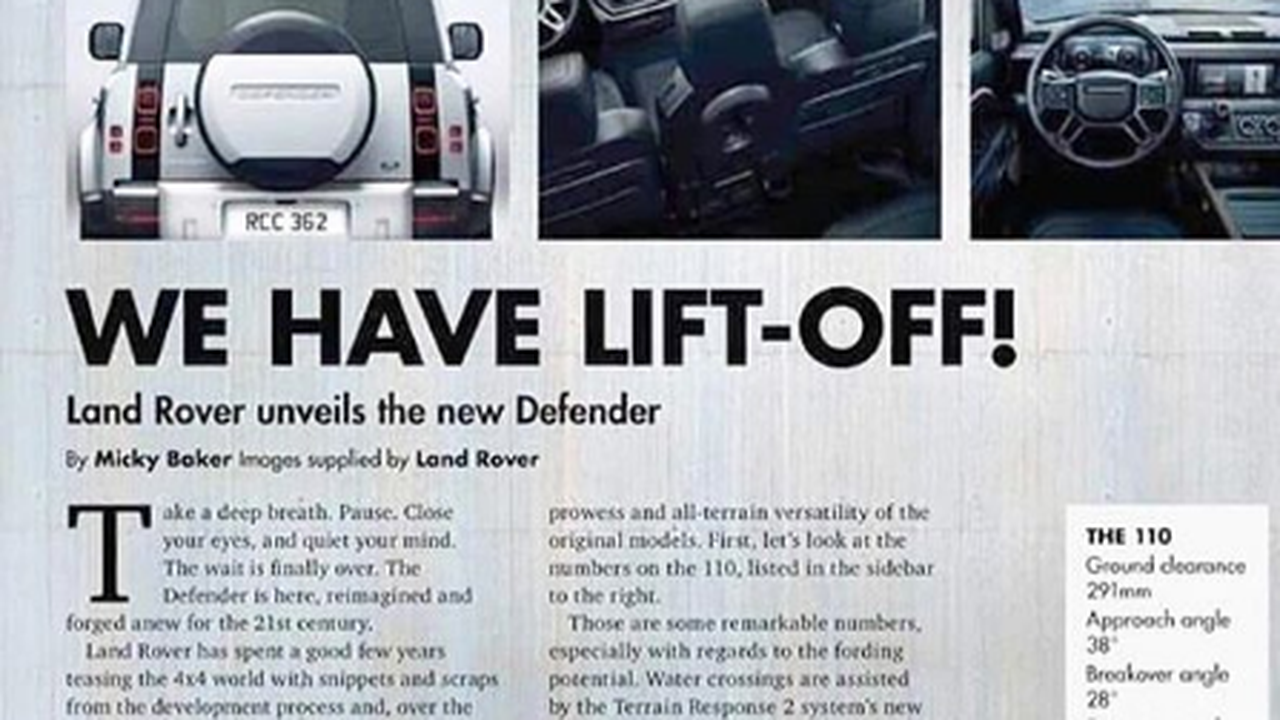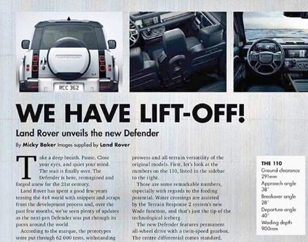 Мировая премьера нового Land Rover Defender состоится только завтра, однако первые официальные подробности о нем появились в Сети уже сейчас. Изображения отсканированного южноафриканского журнала SA4x4 опубликовал пользователь soflorovers в своем Instagram.