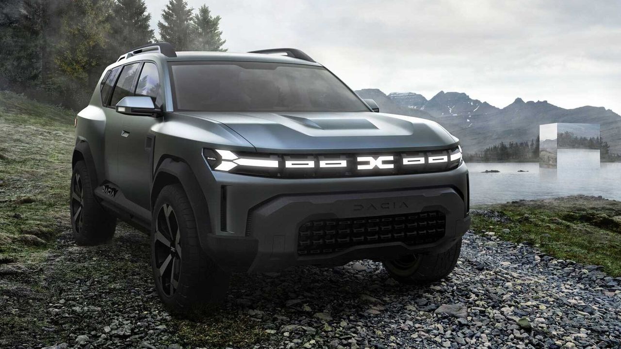 Визуально Dacia Bigster серьезно отличается от всех серийных моделей бренда. Помимо нового логотипа, представленного неделю назад, его выделяют зауженные Y-образные фары, такие же по форме фонари, большие колеса и массивный защитный обвес из неокрашенного пластика.