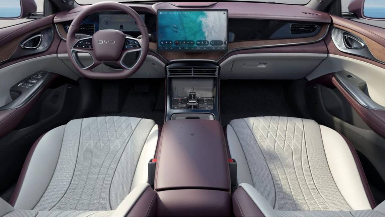 В салоне новый BYD Seal DM-i будет отличаться минималистичным дизайном и высокотехнологическим наполнением. В нем он получит огромный 15,6-дюймовый поворотный экран мультимедийной системы, 10,25-дюймовую цифровую приборную панель, проекционный дисплей, широкий центральный тоннель с двумя площадками для беспроводной зарядки смартфонов, компактный селектор трансмиссии и атмосферная подсветка с возможностью выбора из 31 цвета.