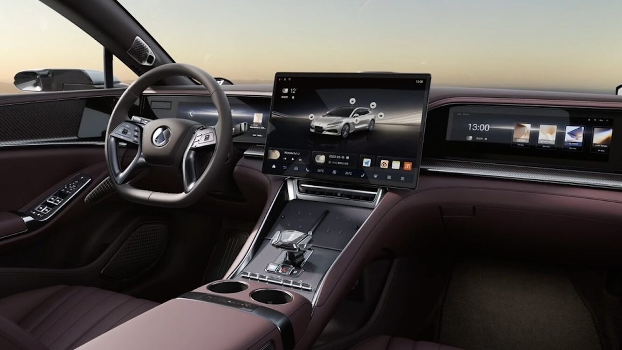 Судя по опубликованным изображениям, в салоне нового Denza Z9 GT установят три больших экрана на передней панели, один из которых выполняет роль цифровой приборной панели, второй — это центральный экран информационно-развлекательной системы, а третий экран установлен непосредственно перед передним пассажиром.