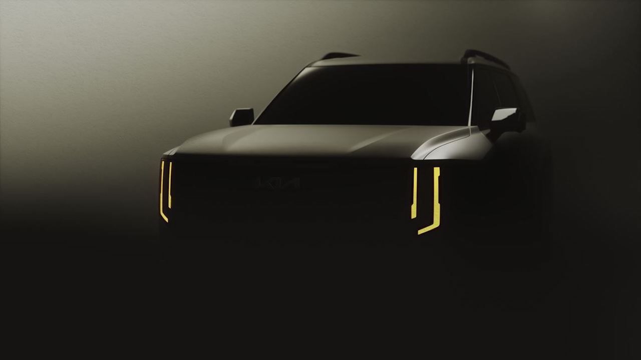 На тизере показана передняя часть Kia Telluride 2027 модельного года с широким капотом, массивными крыльями, крупными боковыми зеркалами и совершенно новыми фарами со светодиодными ходовыми огнями в форме пары вертикальных полос. Окрашенные в черный цвет боковые стойки создают эффект «парящей» крыши.